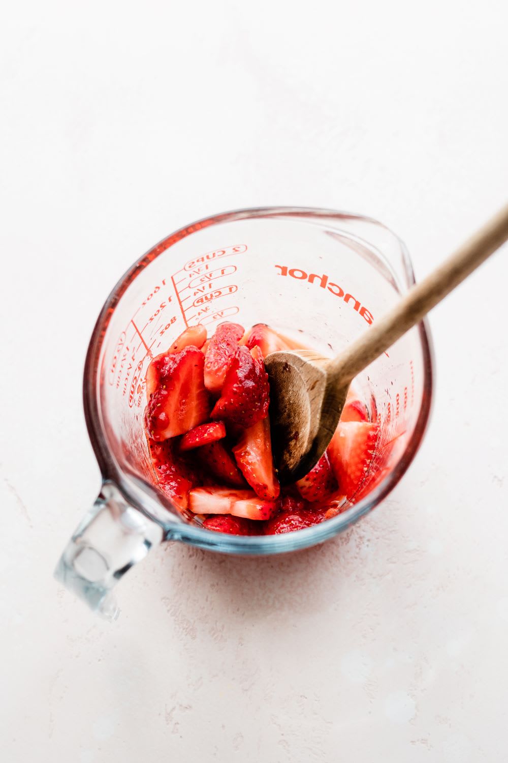For the strawberry syrup. 3 fresh basil leaves. Muddle 6-8 strawberries and 4-6 mint leaves and set aside.